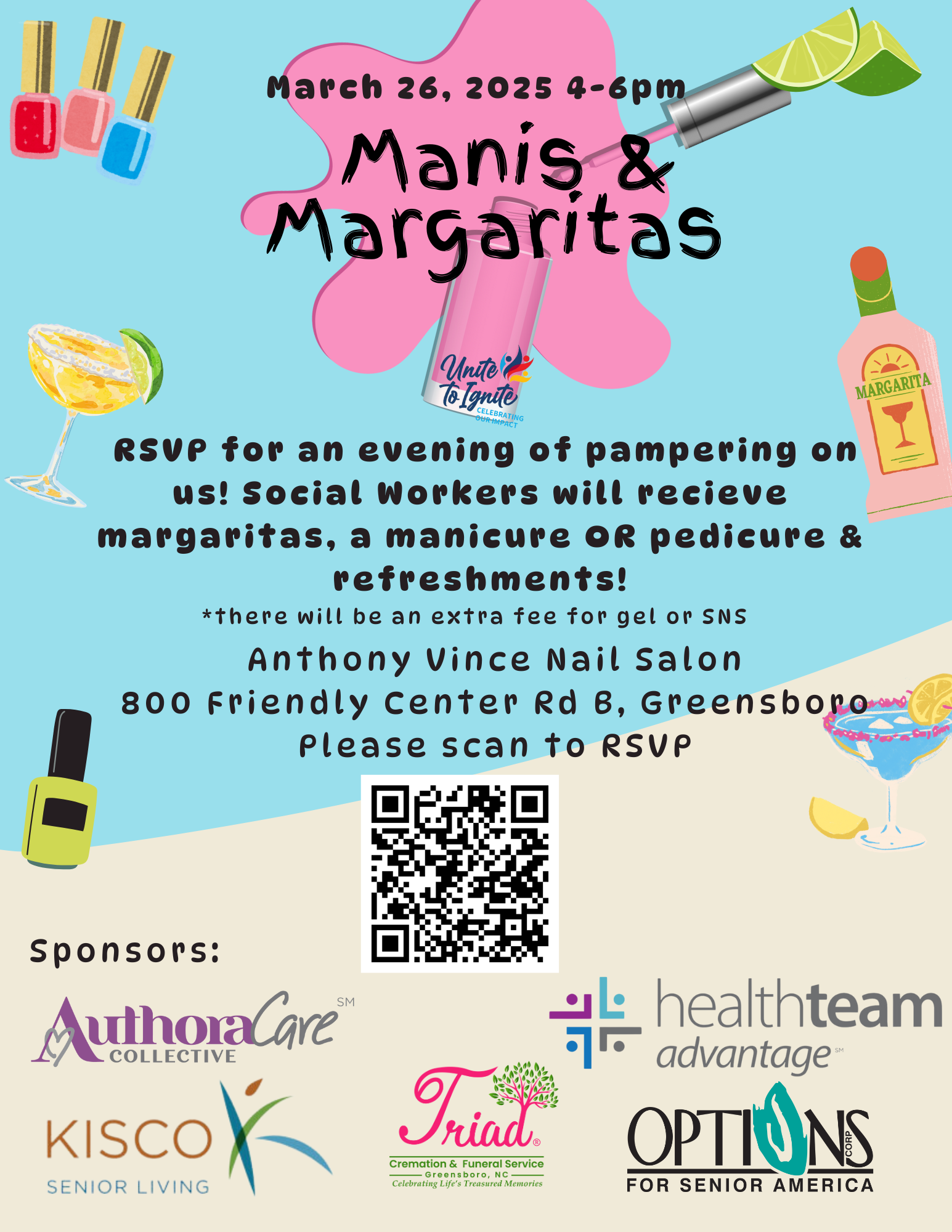 Anthony Vince Nail Salon 800 Friendly Center Rd B, Greensboro, NC, United StatesJoin us for an evening of pampering & appreciating our social workers at Manis & Margaritas!